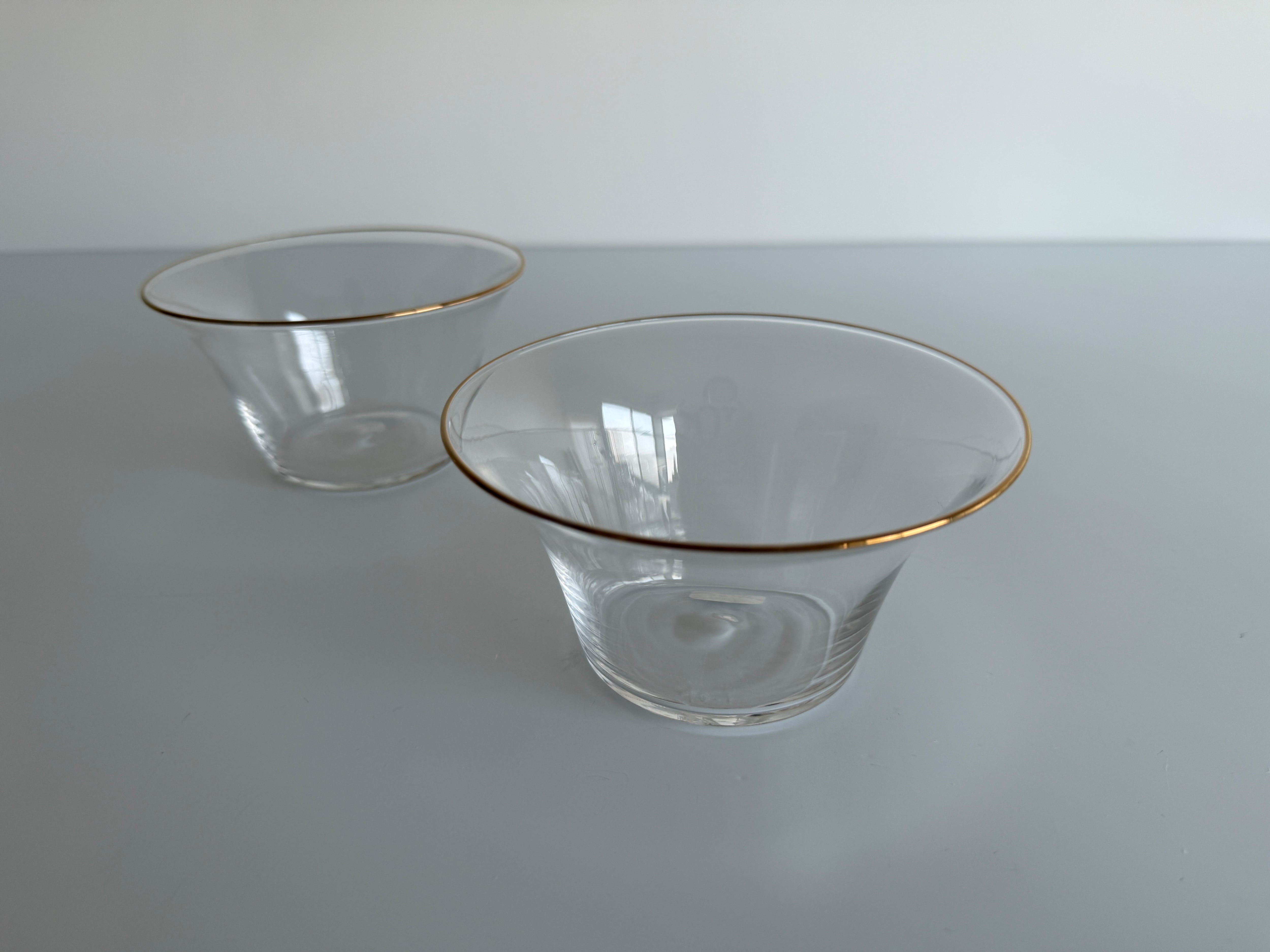 少し深さのある反り鉢で、フルーツやアイスクリームなどのデザートや、サラダやゼリー寄せなどの冷たいお料理が合いそうな、ガラスの透明感と縁の金彩、反りのラインが美しい作品です。いつものかき氷も、とても上品なかき氷になりそうです。